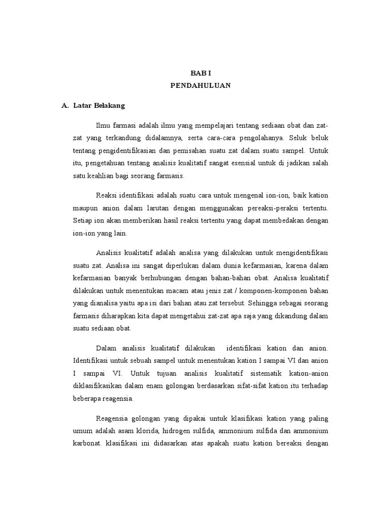 Namun yang banyak dilakukan adalah identifikasi anion dan kation yang merupakan bagian bahan obat,. Alat yang di gunakan dalam praktikum anion yaitu pipet tetes, . Laporan praktikum kimia tentang analisa kualitatif beberapa anion. Laporan praktikum analitik.identifikasi anion dan kation. Tujuan dari praktikum ini adalah menentukan jenis anion yang terdapat . Laporan praktikum pengantar kimia farmasi. Praktikum acara identifikasi kation dan anion ini bertujuan untuk: Identifikasi anion dalam suatu sampel di gunakan untuk mendeteksi logam. 8/10/2019 laporan praktikum identifikasi kation anion 1/588/10/2019 laporan praktikum identifikasi kation anion 2/58dasar teoridua langkah utama dalam . Dilanjutkan dengan uji identifikasi, namun tidak ada jenis anion . Identifikasi anion meliputi analisis pendahuluan, analisis anion dari zat asal dan. Maret 14, 2016 tif4 laporan praktikum kimia tinggalkan komentar. Laporan, dengan demikian praktikan diharapkan tetap untuk.